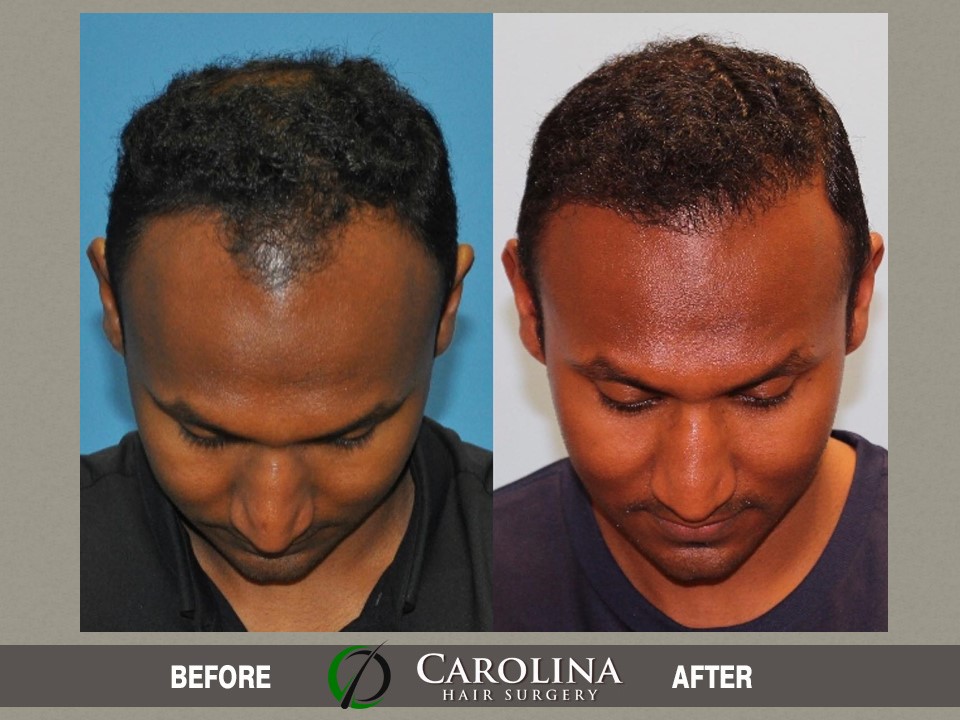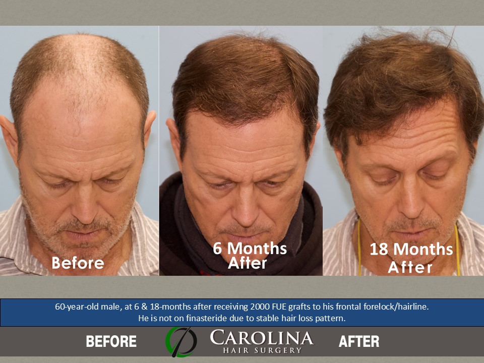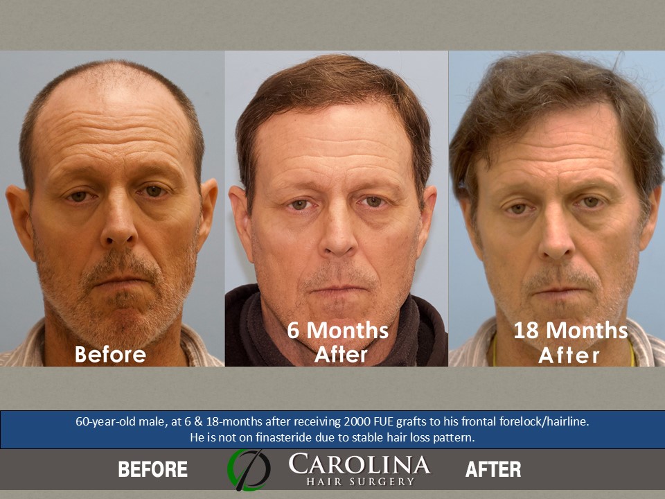Notice: All photos are of patients treated by Dr. Vories and Carolina Hair Surgery, who have given written permission to use their images. Beware that some practices lease devices to perform hair transplantation and use unlicensed staff and manufacturer-provided before-and-after photos that do not represent the work or quality of the practice. Click on the images below to view a larger slideshow. All patient results were accomplished exclusively with FUE hair transplantation.